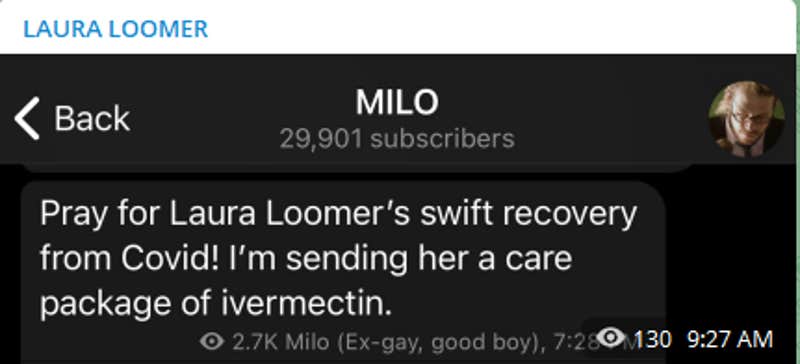 LAURA LOOMER Telegram Channel. Congress in 2020 posted on her GETTR account that she has contracted COVID-19. She has described her symptoms as brutal and said she feels like she got hit by a bus.